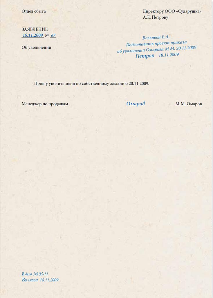 Сотрудником, желающим уволиться, пишется вручную на листке писчей бумаги А4, либо А5 заявление по собственному желанию. Наниматель может также предложить написать заявление об увольнении по согласованию сторон.