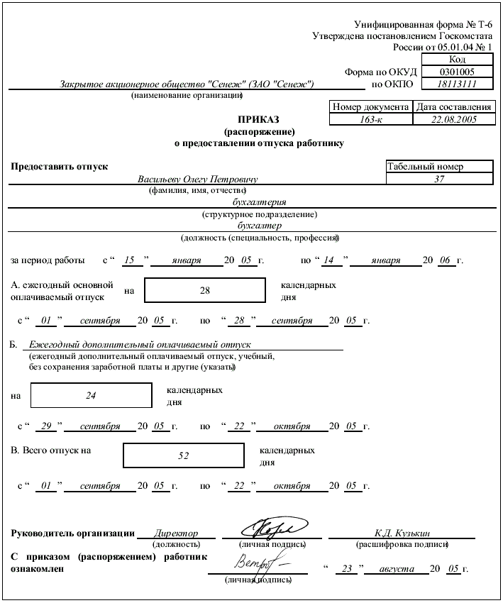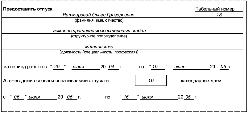 Пример оформления приказа о предоставлении отпуска работнику (форма Т-6) см. в приложении 1, а работникам организации (форма Т-6а) см. в приложении 2.