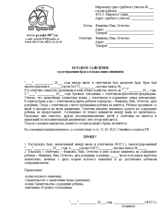 В любом случае, не зависимо от того будет ли раздел имущества, вопросы о местопроживании ребёнка, алиментные обязательства и т.д., в процессе развода следует обратится к юристу, который не только составит исковое заявление о рассторжении брака, но и грамотно, взвешенно представит Вашу позицию в суде, подготовит фундамент для дальнейших исков.
