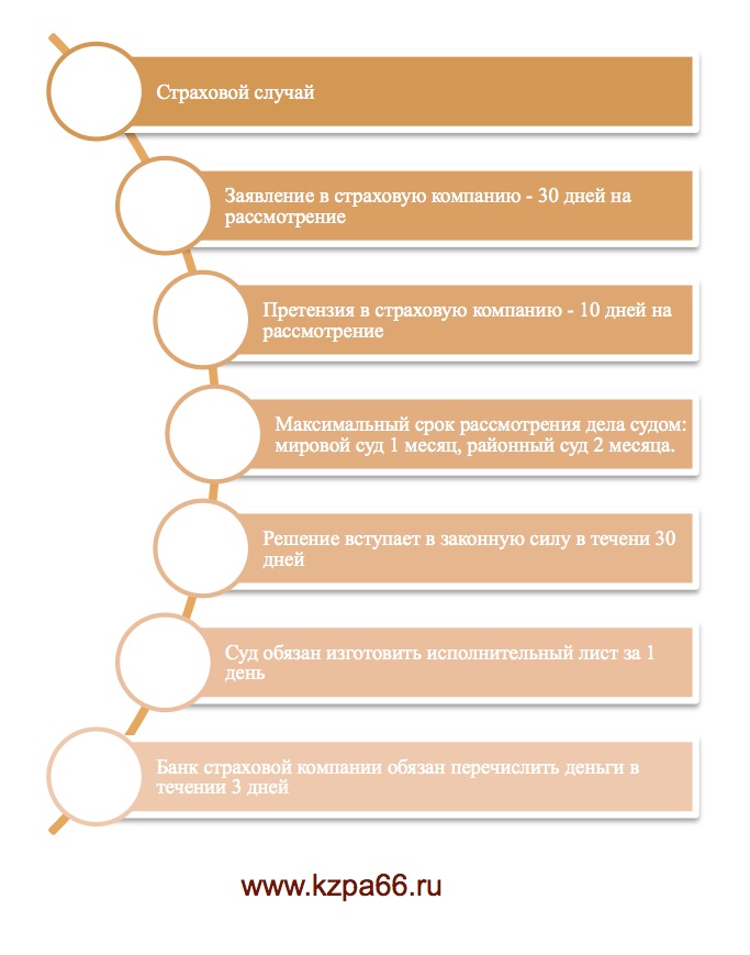 Мы подаем заявление в страховую компанию с приложением всех необходимых документов. У страховой компании есть 20 дней для страховой выплаты (изменения в закон об ОСАГО с 01 сентября 2014 года). Если в течении 20 дней выплаты не будет, то мы обращаемся с претензией.